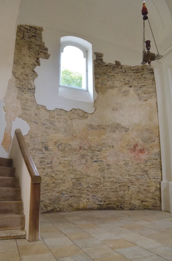 Kresbové rekonštrukcie pôvodného vzhľadu rotundy s pravdepodobným umiestnením pôvodných okenných otvorov, akad. mal. Jozef Dorica